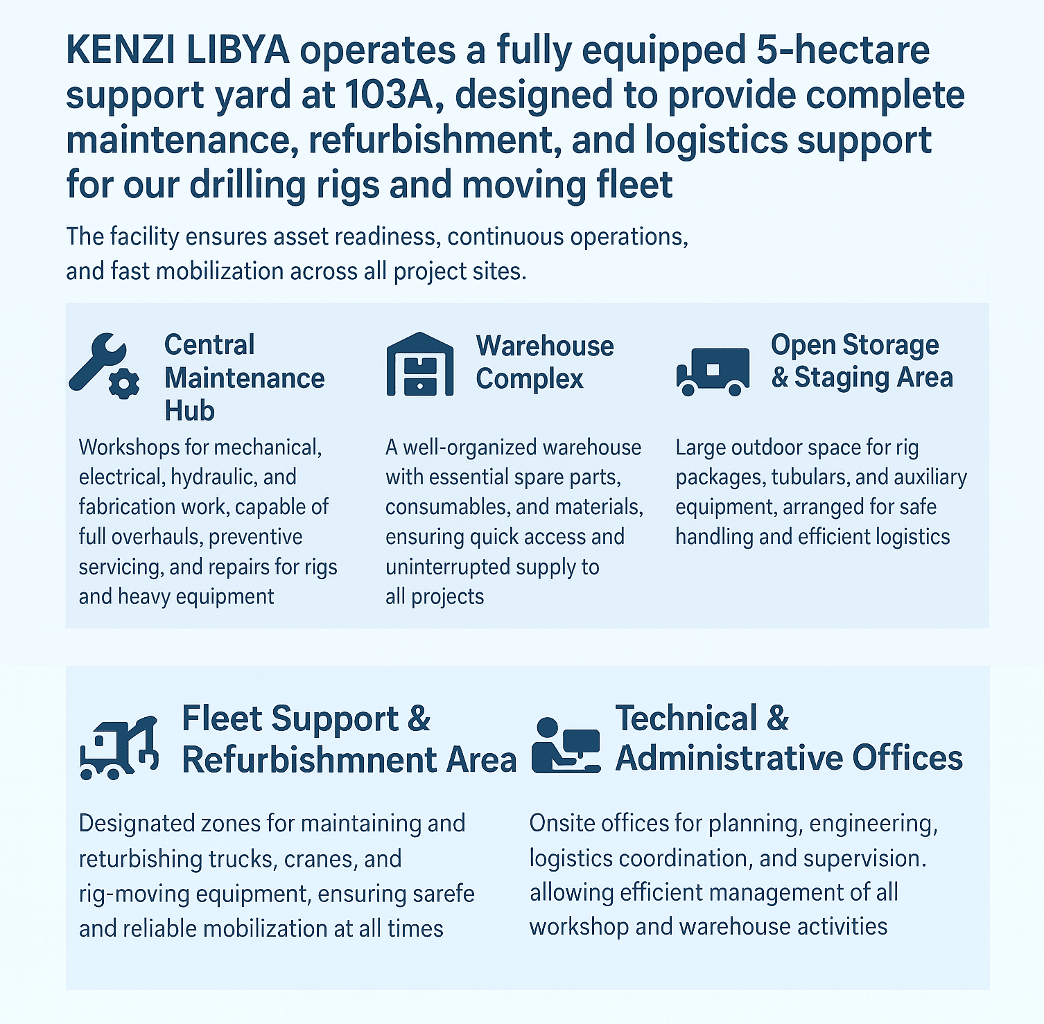 Since 2013, KENZI LIBYA has delivered safe, efficient drilling and workover operations. With modern rigs, skilled crews, and international standards, we are recognized as a reliable oilfield partner across Libya and North Africa.